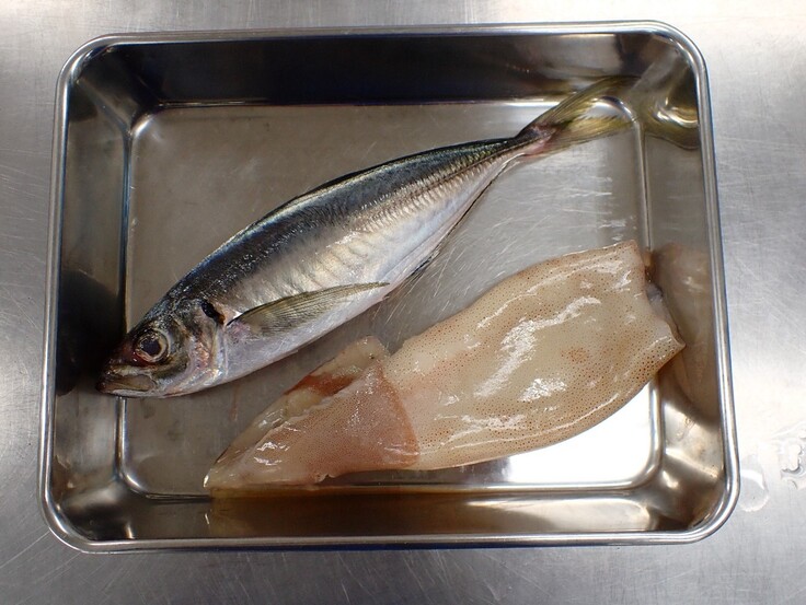 栄養の偏りを防ぐため、エサの数を増やすためにイカも与えています。