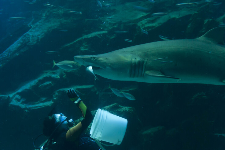 当館のシロワニへのエサの与え方はダイバーが水中にもぐり手渡しで与える方法です。