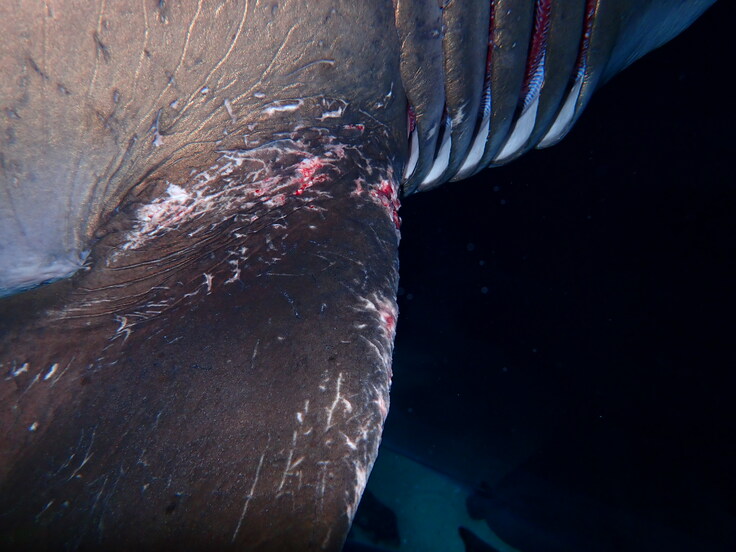 交尾を行うには、オスはメスの体から離れないようにしないといけませんので、シロワニはメスの胸びれに噛みついて体を固定します。これを噛みつき行動と呼んでいます。