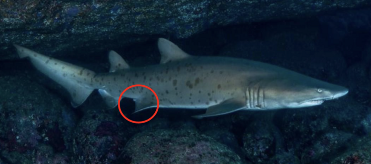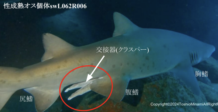 下の画像のような、大人のシロワニのクラスパーの腹鰭に対する大きさを比較すると、上記画像のシロワニは、まだまだ幼体でクラスパーが発達途中なのがわかります。顔もどことなく幼さが残っているように見えます。