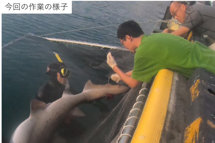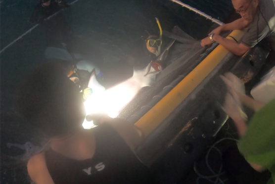 作業を続行するためには、陸から保定網を引っ張り、ダイバーは体が不安定のなかシロワニを保定し、照明を当てることが必要になりました。