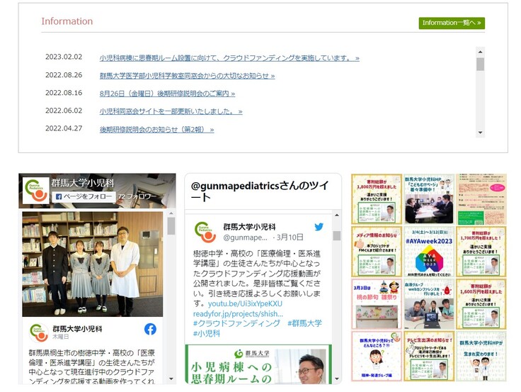 群大小児科のHP(https://gunma-pediatrics.jp/)の仕様が一部変更され、公式FacebookやTwitter、Instagramが見やすくなりました。クラウドファンディングに関する情報だけでなく、群馬大学小児科をこれからも多くの方々に知ってもらえるように情報発信を続けていきます。