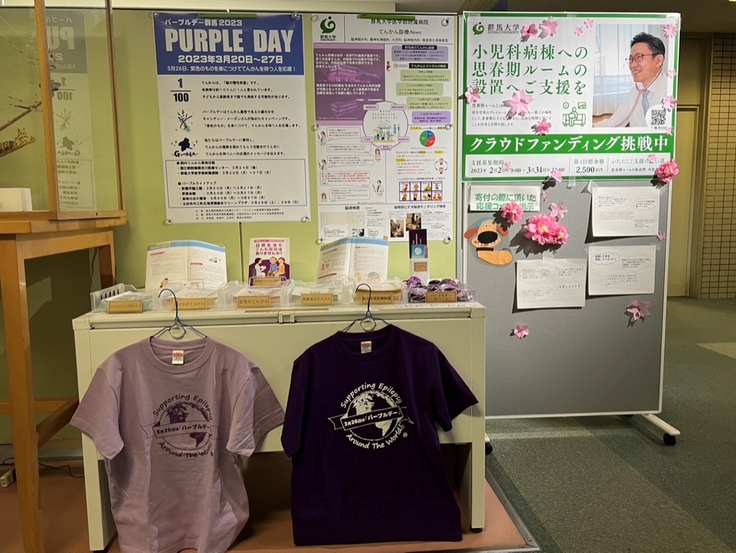 3月26日は「てんかん」の啓発の日「パープルデー」です。カナダの一人の少女が始めた運動が全世界に広がり、各地でイベントが行われています。群大病院でも今年から院内展示を開始しました。また、3月20日から3月27日まで群馬県内各地のライトアップも行っています。パープルデーの展示ブースの横では本プロジェクトを紹介頂いています。