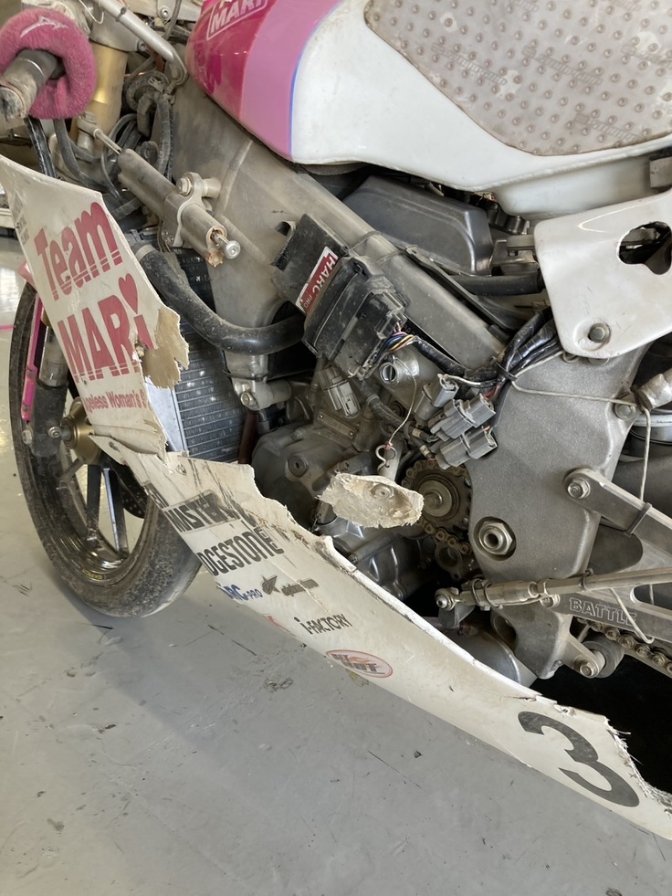 もてぎに続く転倒で、せっかく修理が完了したバイクでしたが、カウルやハンドル・ステップ周りに加え、エンジンに砂が入ってしまった可能性もあり、再度、コンストラクターによる修理やメンテナスが必要となってしまいました。