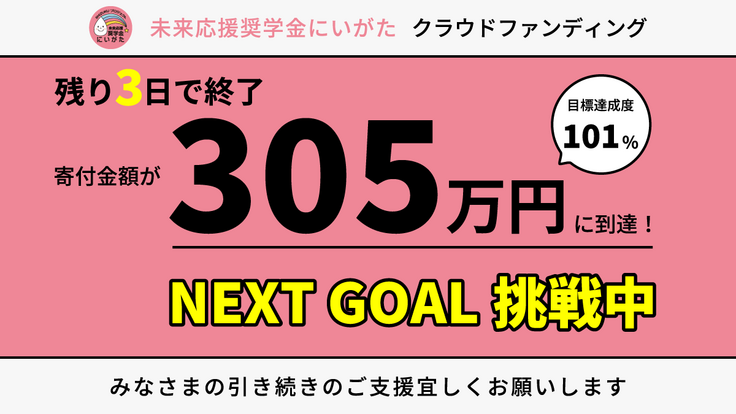 大きな目標額ですが、「新潟県の学生のために」を胸にさらに多くの方からご支援を賜れますよう、頑張ってまいります。