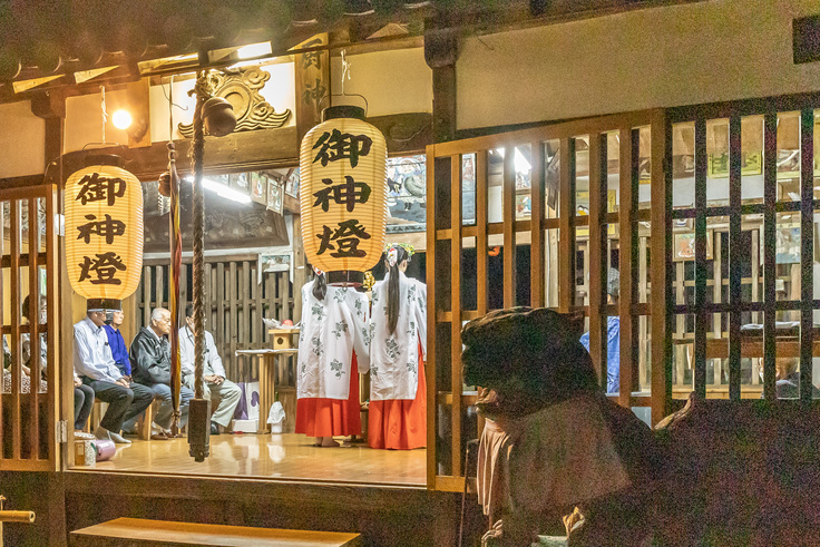 神楽巫女は例年2月の節分祭での神楽舞奉納から始まり、お稽古を重ねて8月には春日大社での神楽講習会、9月の志都美神社宵宮祭を経て10月半ばまで兼務社への神楽奉納をおこなっております。また、年越し正月には巫女達が神社授与所に詰めて破魔矢やお札などの頒布をおこないます。