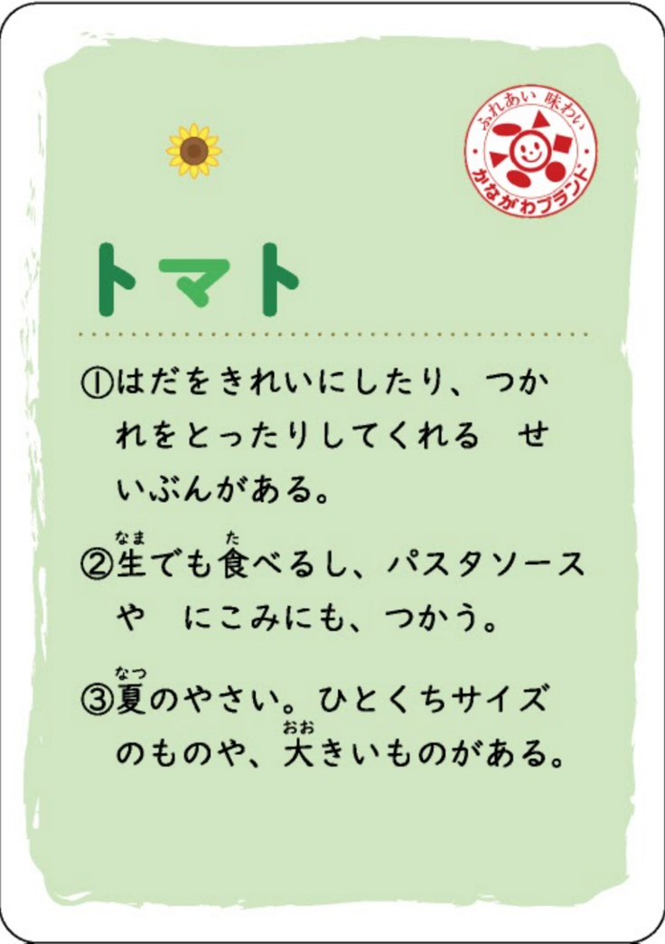 「かながわ食育カルタ」には、身近で採れる食材を知ってもらうために神奈川県ブランドがある食材に「かながわブランド」のマークを使用しています。神奈川県産の食材に目を向けてもらうことで、地産地消や地元の食材を食べることにつなげたいと思っています。
