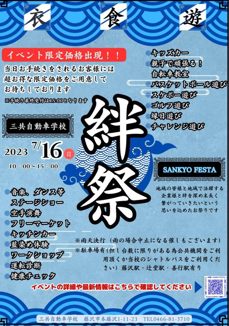 藤沢本町駅から徒歩5分ほどの三共自動車学校で行う夏祭り『絆祭』に出店させていただくことになりました。