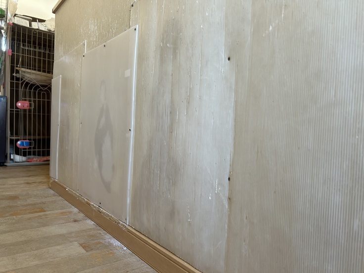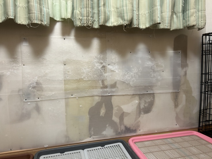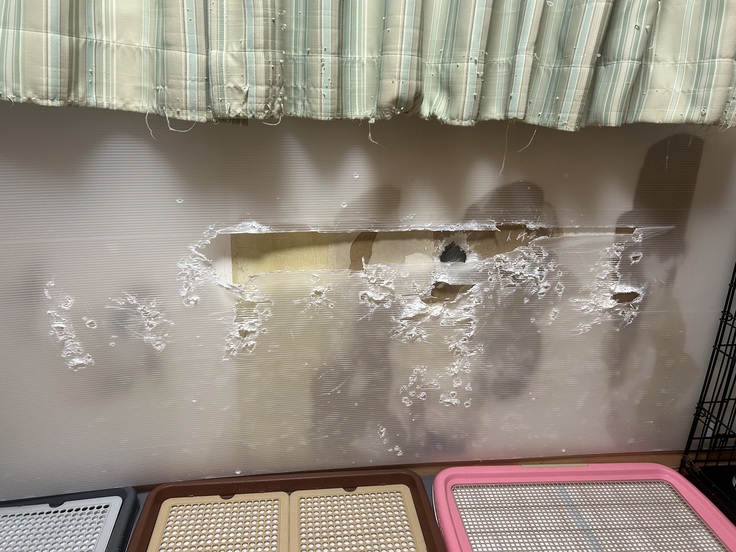 ある日は壁のほりほりが始まり、20分くらいあれば、見事に穴が開きます。すかさずプラ段ボールを貼り付けたらしいのですが、それもすぐ破られたそう。