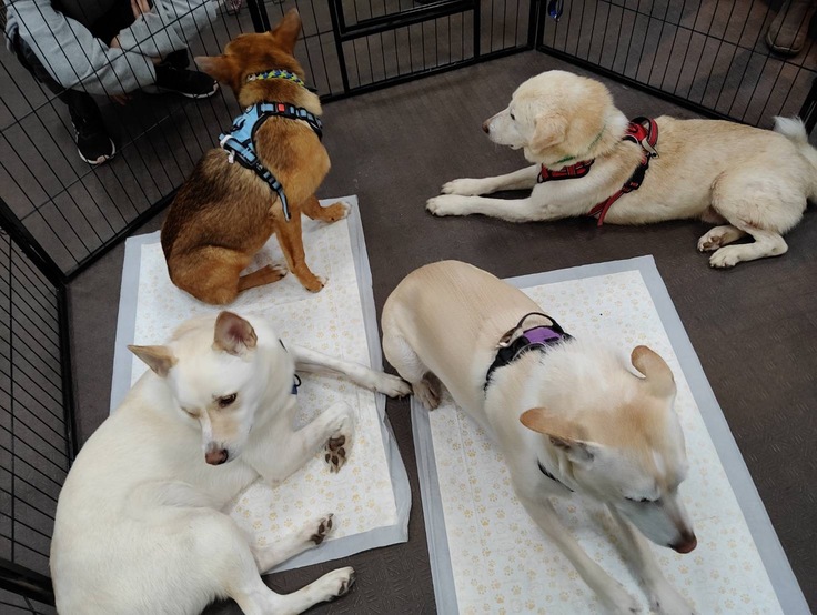 こんな感じでサークルを作って、その中で犬達には過ごしてもらいます。見学者はサークルの外から犬達の様子をみる形になります(サークル内の犬には触れません)。