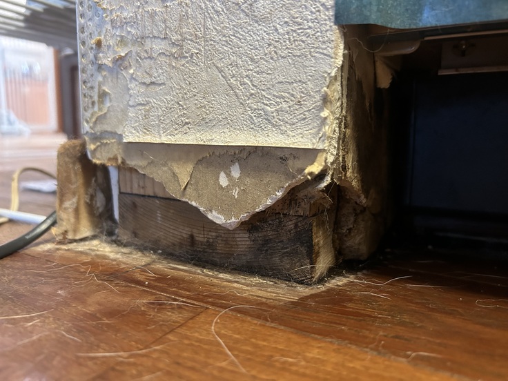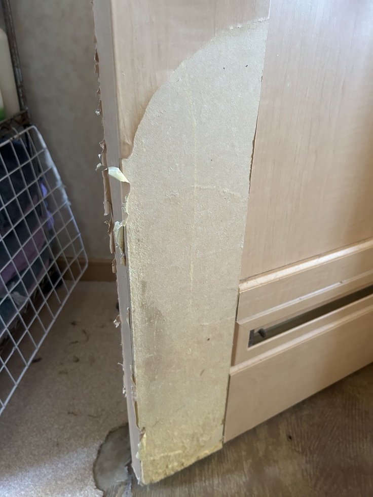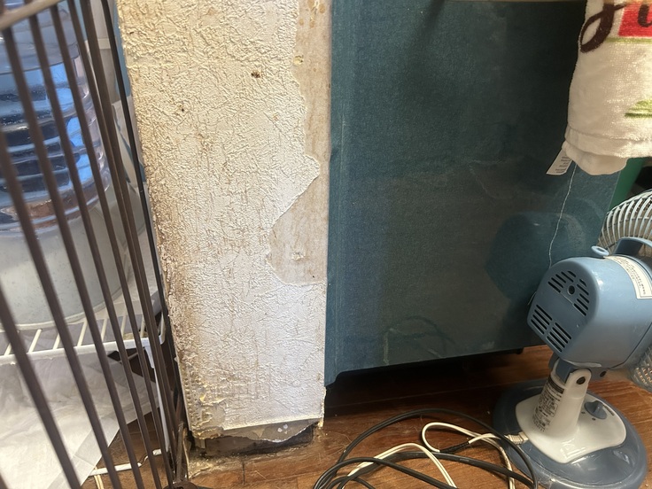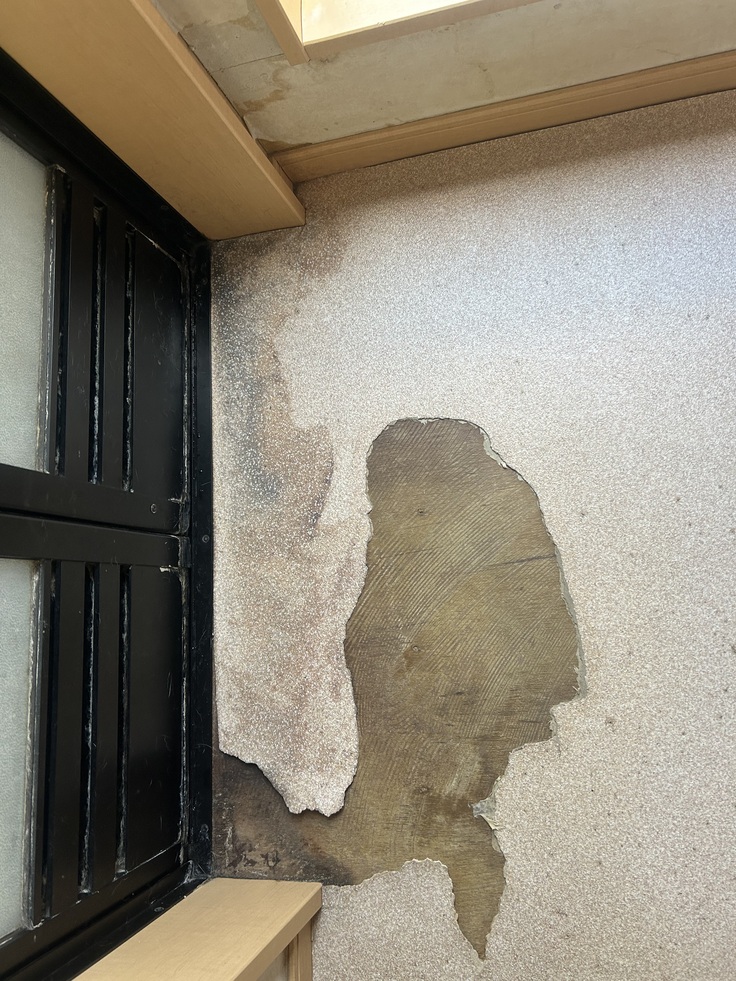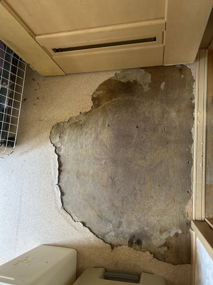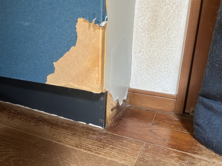 台所の床と背中合わせのリビングの床は、常に水が漏れ、家具や床、壁がいたんでいます…。。