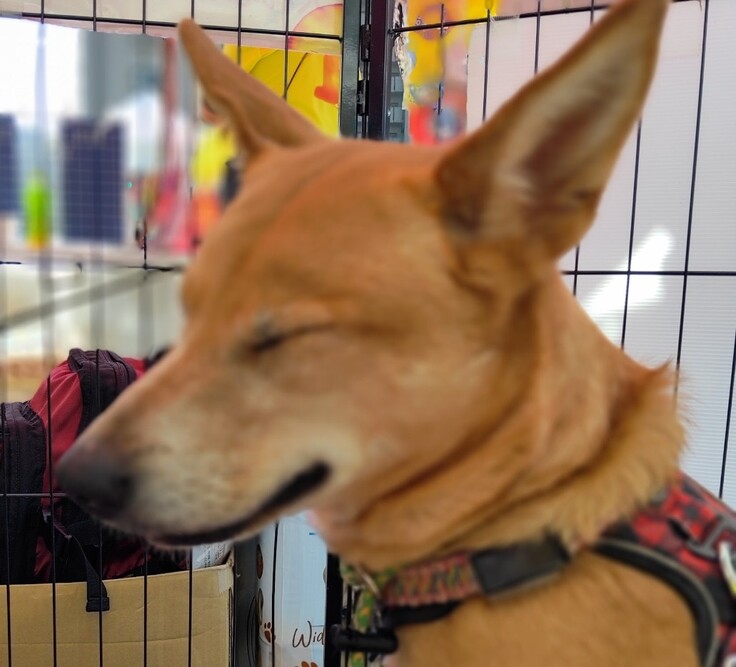 チャコさん、譲渡会の出席率は4割くらいかな。留守番のこともあります。でも人は好きなので、時々サークルの外で触れあい活動を担当することも。これはこれで、犬にとっては誇らしいのか?嬉しそう。