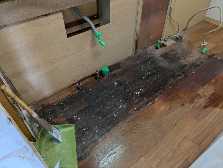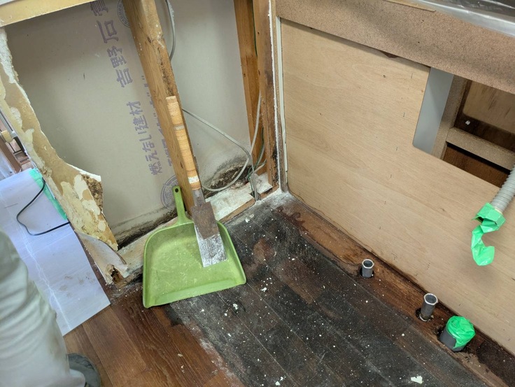 キッチンの部品を外してこんな状態。周辺の木がかなり損傷していることがわかります。さらに深刻なのは、向かって左側の壁。