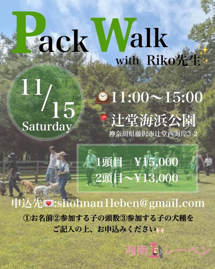 今週末イベントです。リコ先生は代表いわく、日本で1番人気があるドッグトレーナー。なかなか機会が得られないパックウォークです。