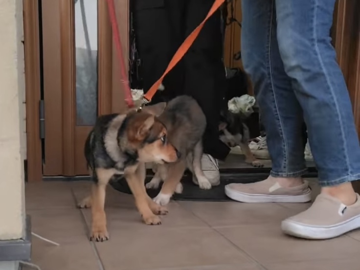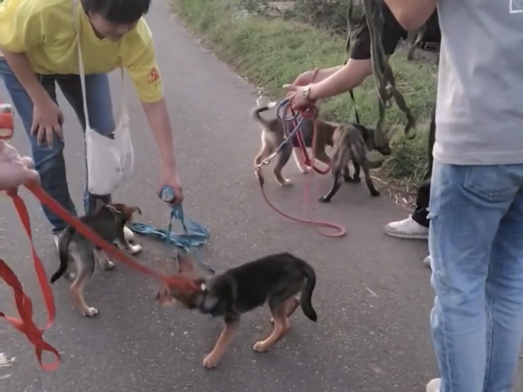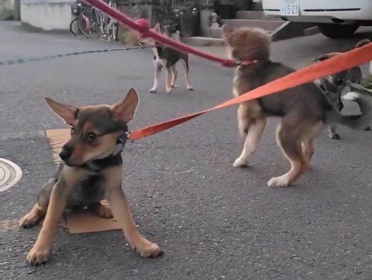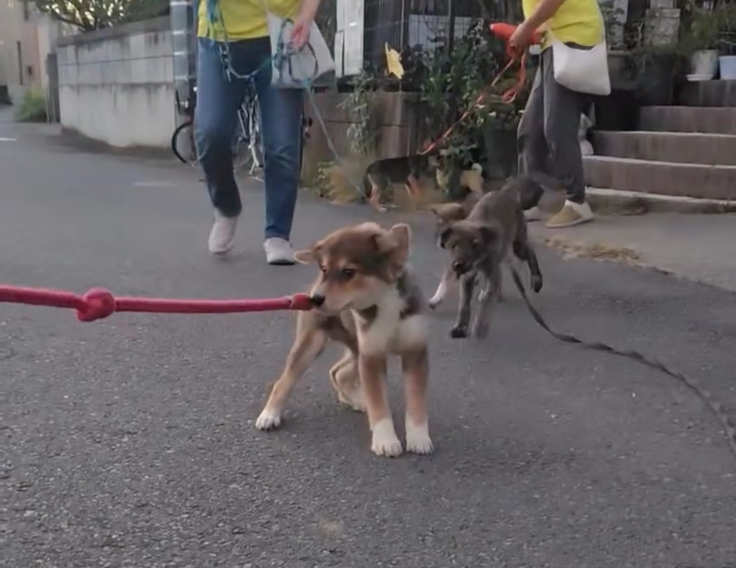 おそらく他の犬の匂いが残っているところに、集まって確認。この子達がすいすいと前を向いて歩いていくまで、もう少しお勉強が続きそうです。みんな初めはそうだったんだから。大丈夫。お散歩は楽しいよ。