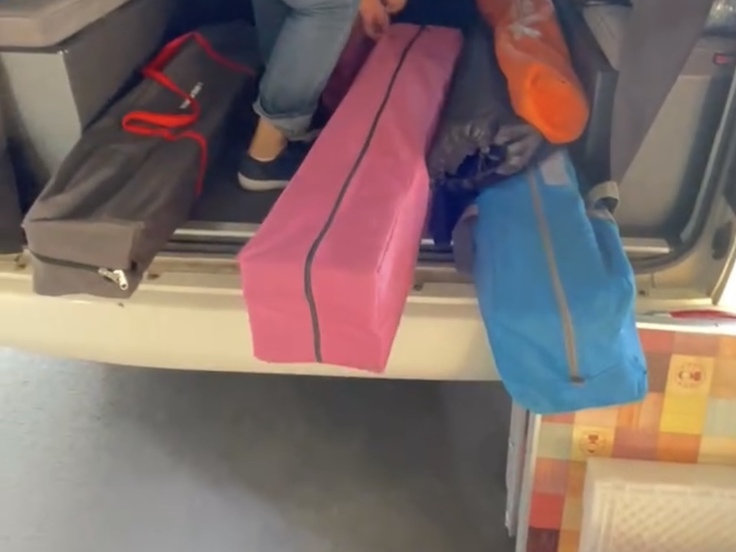 車が走る時に揺れると崩れたり、大きい音がして車内の犬が怖がったりしますので、さまざまな形の物を隙間なく組み合わせて詰めていきます。目撃した里親さまが「ノート1冊挟まる隙間もないですね」と、先日例えられていた言葉選びがまさにその通りでした。