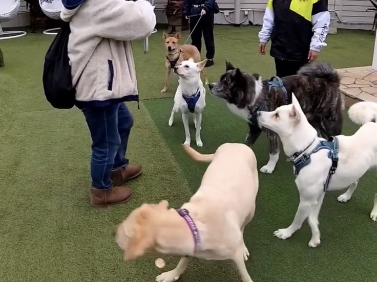 これまでも犬の幼稚園など、トレーニング施設で譲渡会をした時などは、交代でドッグランエリアに出したりはしていたのです。でも興奮しちゃうし、他のお家の子と仲良く利用できるかわからないし。精鋭部隊ではありますが(どんな意味で選ばれた?)、この日はたくさんのボラとわんこが繰り出しました。