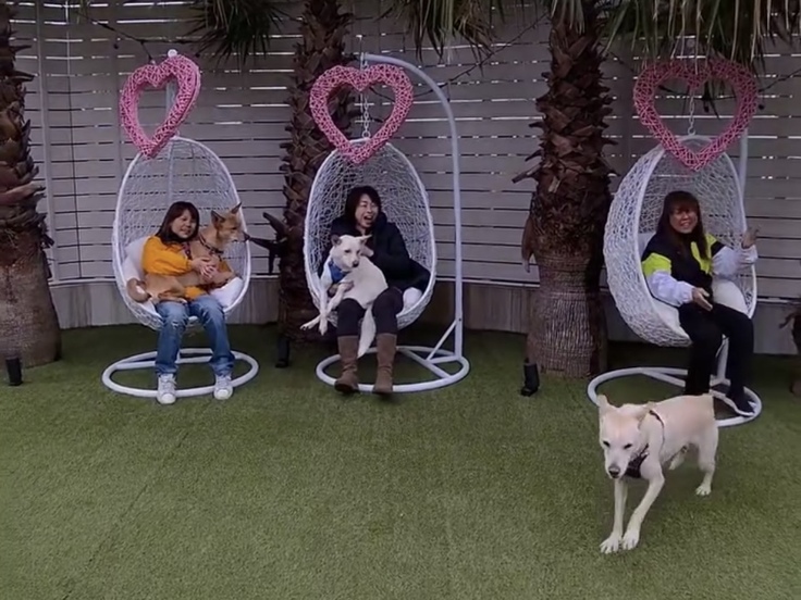 動き回る犬に囲まれる代表。これは幸せの典型的な風景かも。