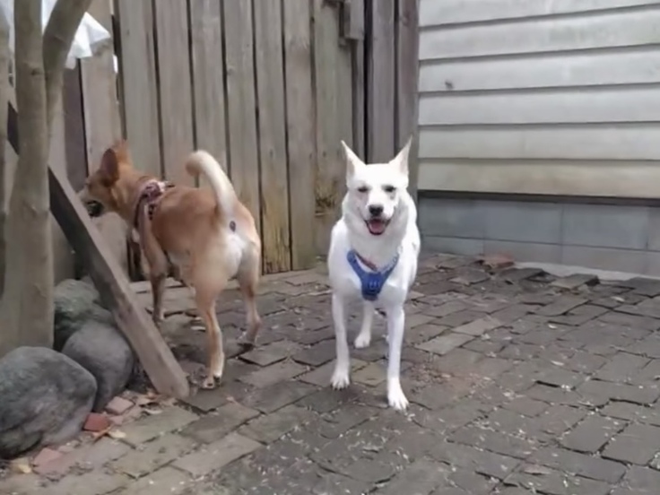 かなり以前に卒業したけれど、ちゃんとレーベンのことは覚えているらしく、ご無沙汰してます、の挨拶。在籍中よりもリラックスしていて、他の犬ともふれあった経験からの成長を感じます。おう、元気にしてた?