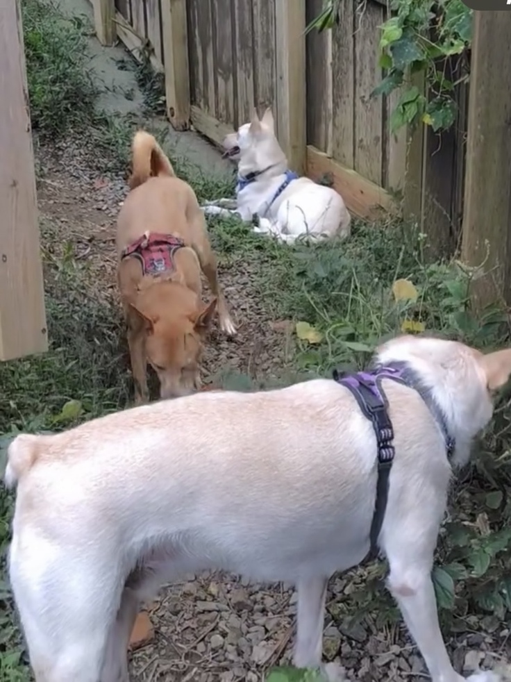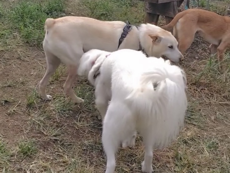 レーベンのボラスタッフとしては、人の整備によるドッグランでの様子や馴染みのある犬同士の過ごし方のイメージはあったものの、今日連れて行った3頭が他の犬と仲良くできるのか、不安をもった者も事前にいました。慣れたボラにはフレンドリーだけど、譲渡会で来場した人や犬に強く吠えることもあったし、どうなるんだろう。