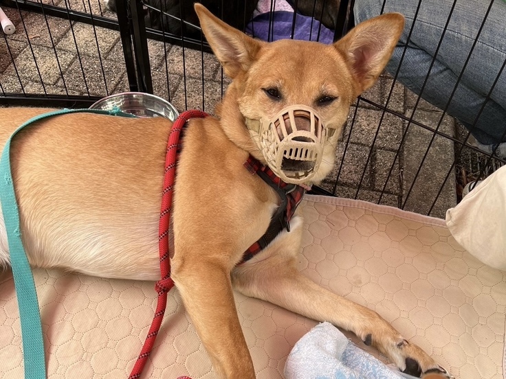 興奮しやすいちゃこは、マズルガードをつけました。見た人に「可哀想」と言われがちですが、これできちんと落ち着くことができるので、犬の為にも大切です。昼寝しようとするくらいのリラックス。