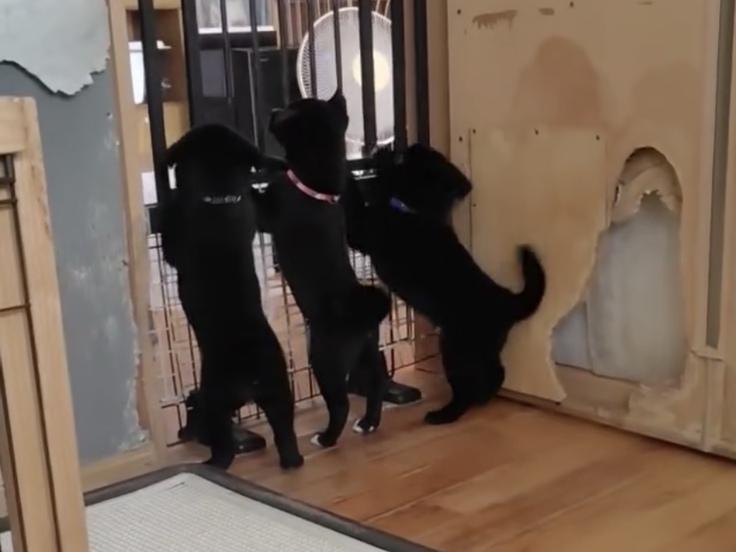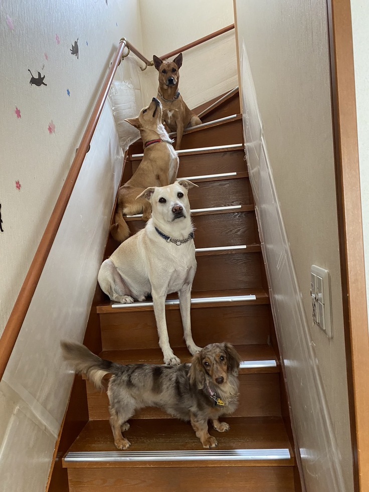 この、ご飯待ち行列の可愛い様子、よく見れば両側の壁に応急処置のプラスチックダンボールを取り付けていることがわかります。床を掘るならわかるけど、壁?と思われるでしょうが、犬はかじったり引っ掻いたりする遊びが大好きです。