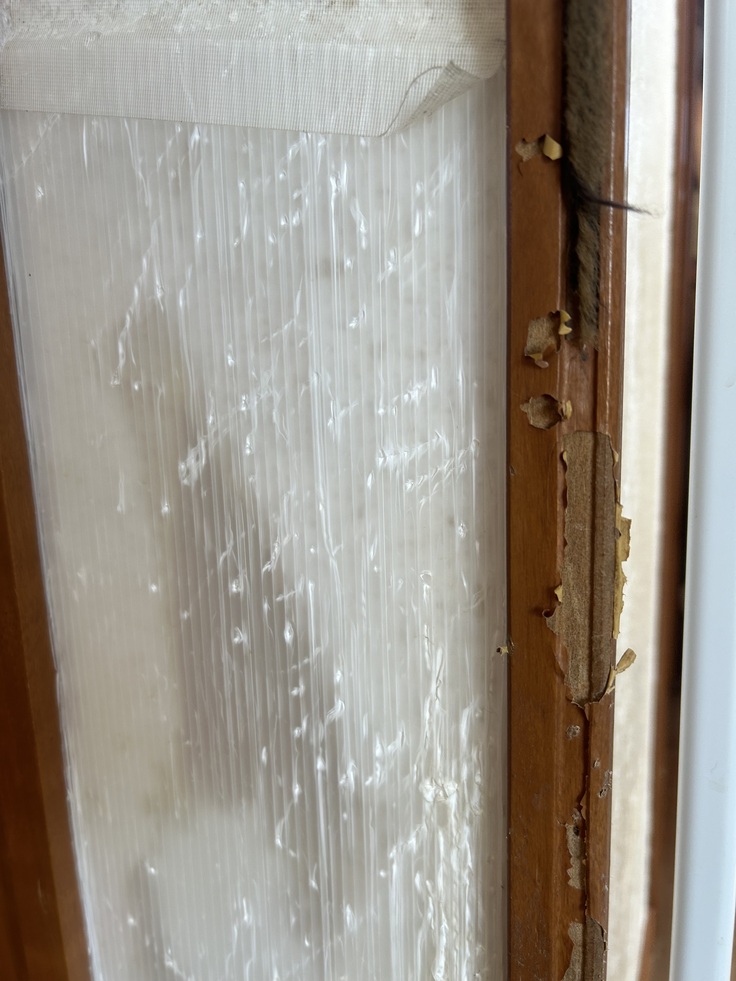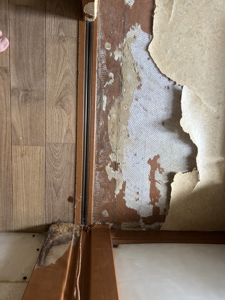 寄せたカーテンの陰に、今日も見つけてしまいました。下地は防水性がないので、すぐ対応する必要があります。