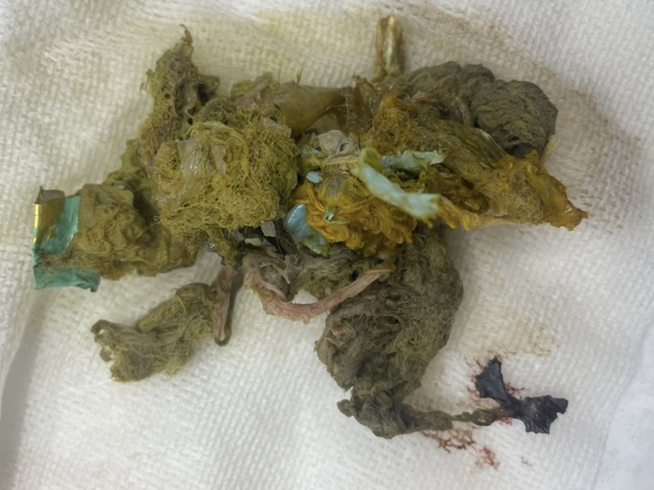 タオルの繊維や綿のような物、養生テープ、ちゅーるの袋などが絡み合い、ひとつの塊になっていました