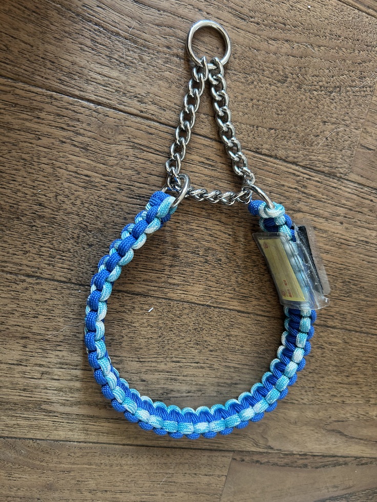 真ん中の金属リングを引くと首周りの長さが変わるタイプです。このパラコードのものは、卒業犬の里親さまがお願いした色や大きさで作ってくださったものを販売しています。水や摩擦に強い素材で、丈夫に作られていますが、ワンプロが激しい環境などでは特に損傷が出ていないか、いつも確認しています。