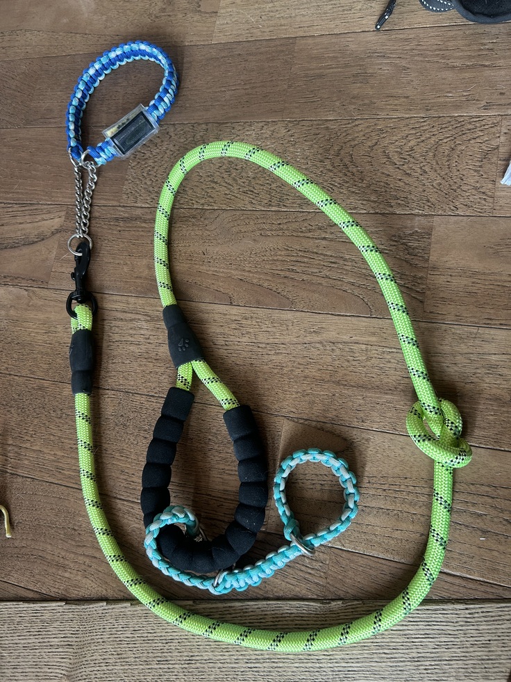 引きに負けないようにつかみやすく結びこぶをつけたり、手首からリードが離れないように人の手首につけるリードホルダーを着けたりしています。
