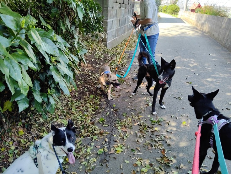 レーベンのお散歩への考え方は、犬にとって必要な刺激であり、運動だというのが基本です。野犬達は人と一緒に歩くお散歩は経験しておらず、崩壊現場や不適切な環境での飼育からのレスキューでも、お散歩の経験が足りない犬が多いです。