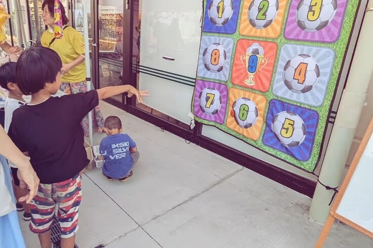 高い点数のところに当てるほど、いい景品がもらえます。手で手裏剣をなげたり、足で柔らかボールを蹴ってシュートを決めるお子さんも。
