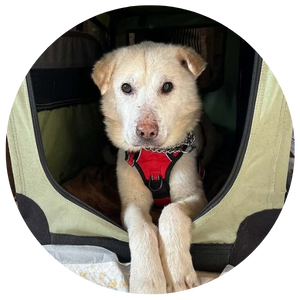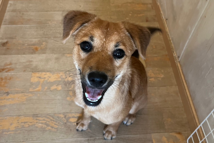 保護当初は「何もかもが怖い」と言うような怯えた表情だったエールですが、同郷で保護した老犬オリバーと仲良くなり、今ではいつも一緒にいます。保護部屋を整えたことで、他の犬たちからよい刺激を受けて自分からも少しずつ意思表示をするようになり、犬同士でじゃれ合う「ワンプロレス」も見られるようになりました。「ハウス!」の声がけで、ケージにスムーズに入れる賢い子です。