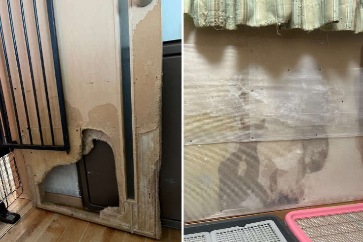 また、ワンコの中にはまだトイレレッスン途中の子犬もいて、あちらこちらでオシッコをしちゃうので、スタッフが気付いてすぐに拭いても少しづつ床板への染み込みが蓄積されています。床板は何度か張替えたりするもボコボコに浮き、壁のパネルも度重なる補強もそろそろ限界です。