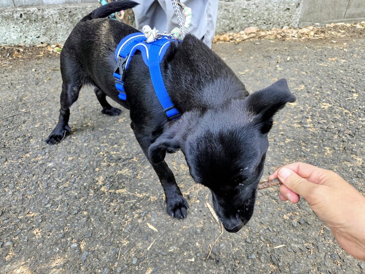 腹に詰まるかどうかは別として、夏は散歩の道で見つける虫なども食べないでもらいたいものです。お腹が空いてるとかではなく、ちょっといじって口にしようとするミミズやカエルの干物。地面が暑すぎて地表に出て生き絶えたりするのです。匂いがあるのか、見た目はジャーキーみたいですが、寄生虫の心配もあり、毒エサの可能性もあり食べさせるわけにはいきません。でも、すごい数。お小言言っても効かないから、リードさばきや方向転換で指示。多頭引きしている時は、目が回りそう。