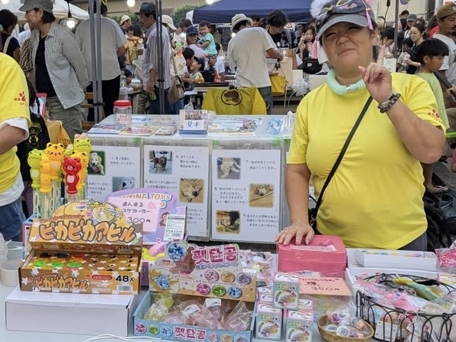 イベントでお子さま連れなどの来場者が足をとめやすい、光るおもちゃやお菓子釣りゲーム、的当てや綿菓子作り体験などのコーナーを開いて呼び込みながら、順番を待つ間に保護犬に関する啓発展示資料を見てもらったり、団体を知らせるパンフレットやクラファンチラシをお渡ししてお持ち帰りいただいたりしています。夜店に歓声を上げお帰りになる時に、ここの収益は保健所などからの犬の保護活動に使わせていただいています」と声をかけると「え?
