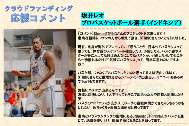 B3リーグの湘南ユナイテッドBCで活躍していた坂井レオ選手から応援コメントを頂きました。