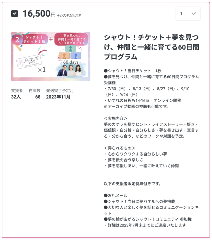 さて、今日はタイトルにもある通り、松下りせいちばんのオススメのリターンをご紹介させてください!最も推しのポイントは、16,500円のご支援で、「シャウト!当日チケット」、「夢を見つけ、仲間と一緒に育てる60日間プログラム 受講権」をはじめ、たっくさんの内容がついてきます!