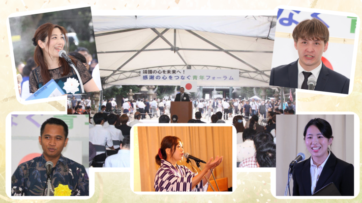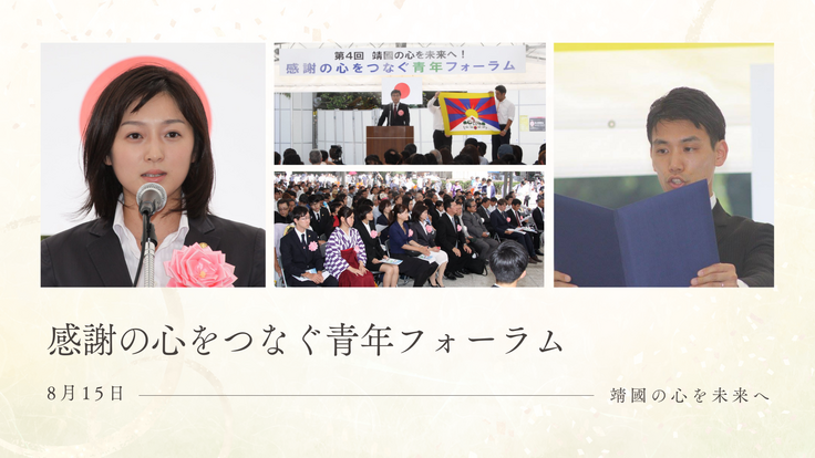 「慰霊の心・靖國の心を次世代につないでいくことは青年世代の使命だ」 私たちはこの思いを胸に、毎年8月15日に靖國神社境内にて「靖國の心を未来へ!感謝の心をつなぐ青年フォーラム」を開催している団体です。 「慰霊の心を次世代へ」 「靖國の心を世界と共に」 この二つの趣旨のもと、日本の学生・青年世代から提言を行い、また海外出身の留学生や青年にもご参加いただき、戦歿者追悼と世界の平和・友好・繁栄の祈りを捧げています。