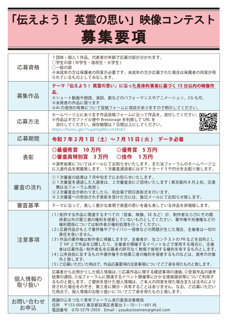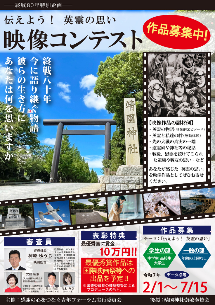 これから終戦90年、100年となる中で、先の大戦における英霊の思いと、それを感謝の心をもって繋いでいくための映像コンテストに、ぜひともご協力いただければ幸いです。