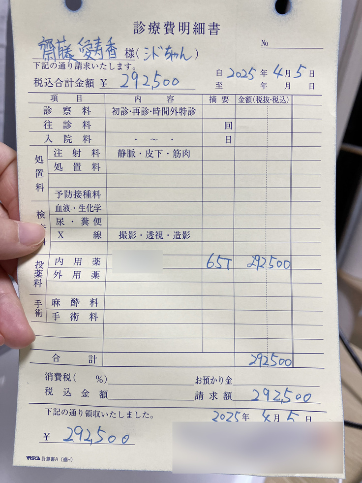 添付の治療費は4/5時に出していただいた投薬代292,500円と、