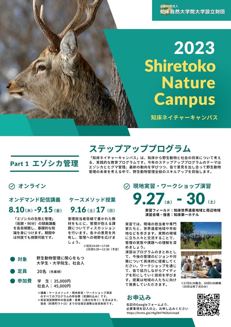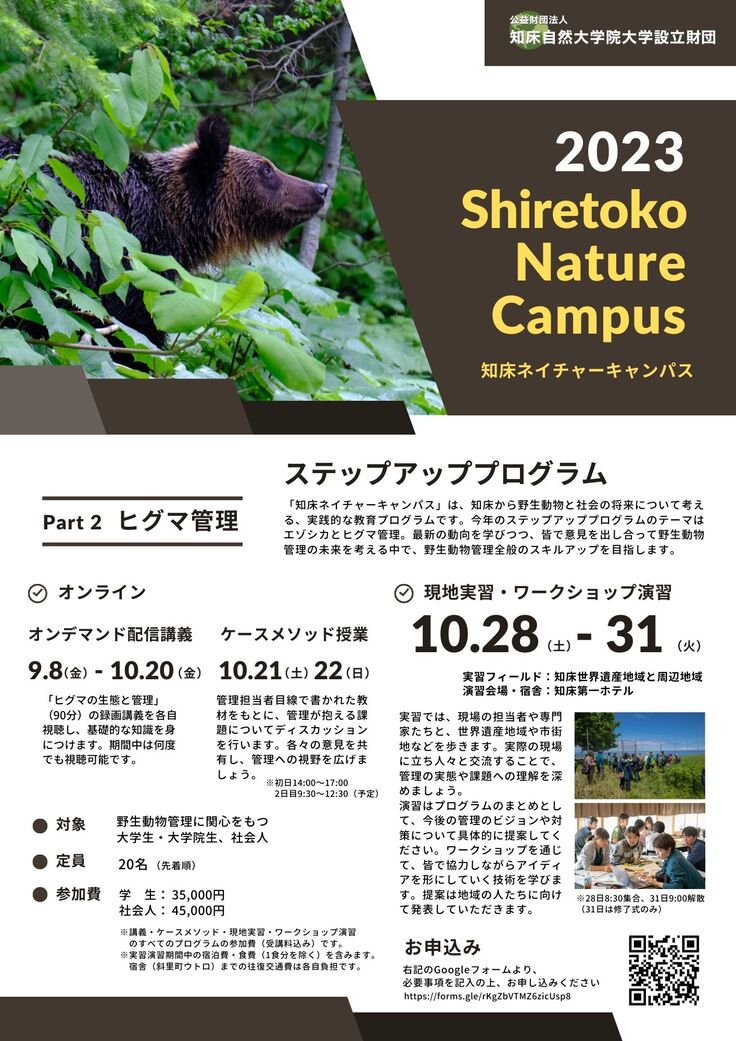 公益財団法人知床自然大学院大学設立財団は2023年8〜9月にエゾシカ管理、9~10月にヒグマ管理をテーマとした教育プログラム「知床ネイチャーキャンパス2023・ステップアッププログラム」を開催します。