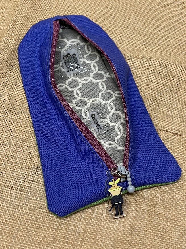 表には心合寺山古墳の形を表現して、それを守るように裏にはハニワこうていのアクリルキーホルダー、ペンケースの中には、古墳の被葬者も表現されています。長さは21cmほど、幅は10~12cm程あります。(協力:chiki*mocaさん)