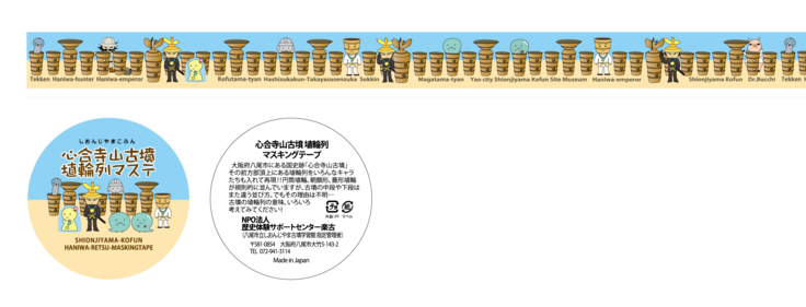 これも学校へ持って行けるグッズが欲しい!という「バスケットマンくん」の発想から誕生。ハニワこうていはもちろん、当館の様々な古墳キャラたちを学校で一番需要がありそうな方眼ノートの表紙としてデザイン、さらにマスキングテープのデザインにもキャラをたくさん入れて作りました。