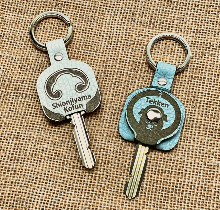 また以前、当館で作った「鉄剣(てっけん、犬です…)」というキャラの頭部を裏面に。表裏で実測図とキャラのデザインが入っています。レザーの色はホワイトとライトブルーの2色にしました。