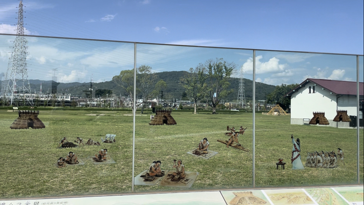 そんな弥生時代の暮らしを描いたイラストがガラス板に。背景の遺跡と重ねて当時の様子を知るという…超アナログな手法ですが、スマホもいらず誰でも視覚的に分かるように。最近インスタントカメラのチェキが大人気らしいですが、この手法も逆に新しいかも!?