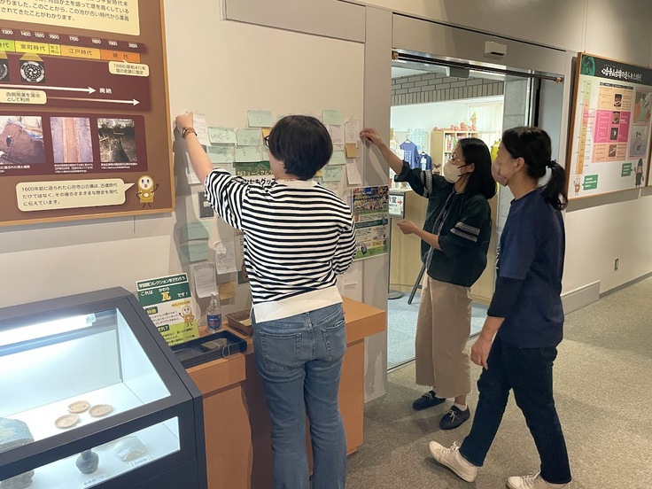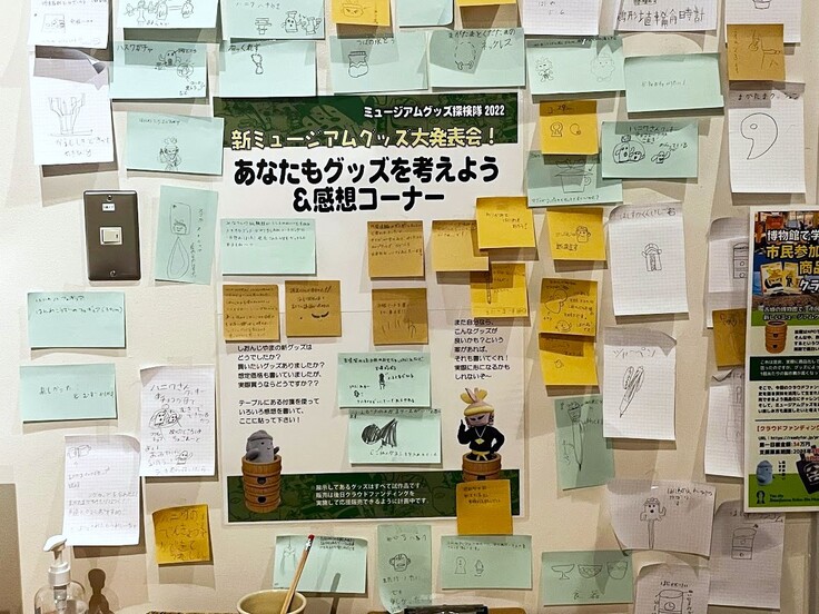今日は初回という事で当館で開催。お題は、現在展示室で開催中の当プロジェクトのトピック展示を見学した方が、付箋に自由に書いてくれた「あなたもグッズを考えよう」を元に、さらにグッズ案を考えるというもの。