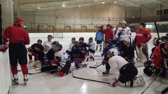 アイスホッケーの氷上練習は、1回2時間で、参加者全員が防具を身に付けた状態で棒状のスティックを使い、パックを操るなどして練習します。