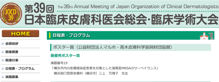 今年の6月に開催された第39回日本臨床皮膚科医会総会・臨床学術大会において、三上先生がこの結果を発表したところ、最優秀ポスター賞を受賞しました(201演題の中で1番)。