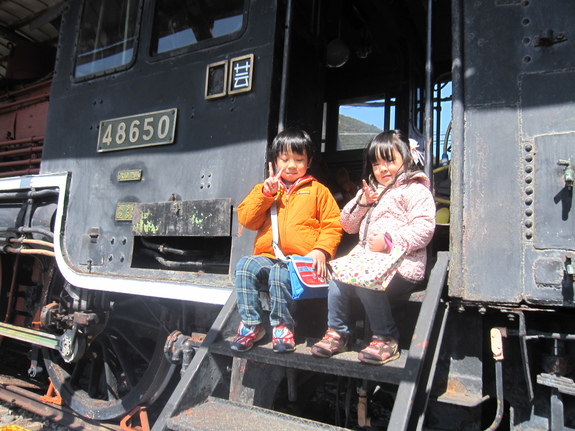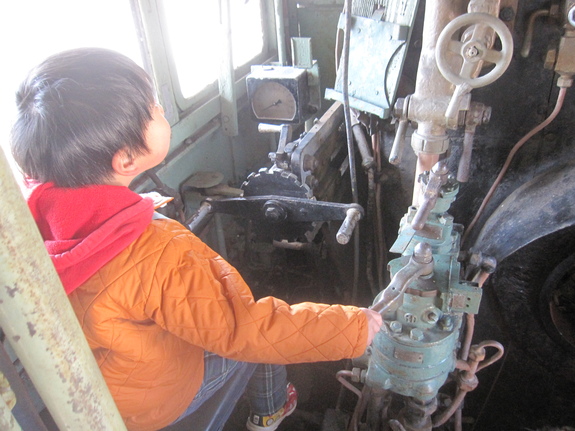 運転席に座り、汽笛を鳴らし、レバーやバルブ操作など蒸気機関士の体験ができます。(〜2016年3月まで、土日限定)